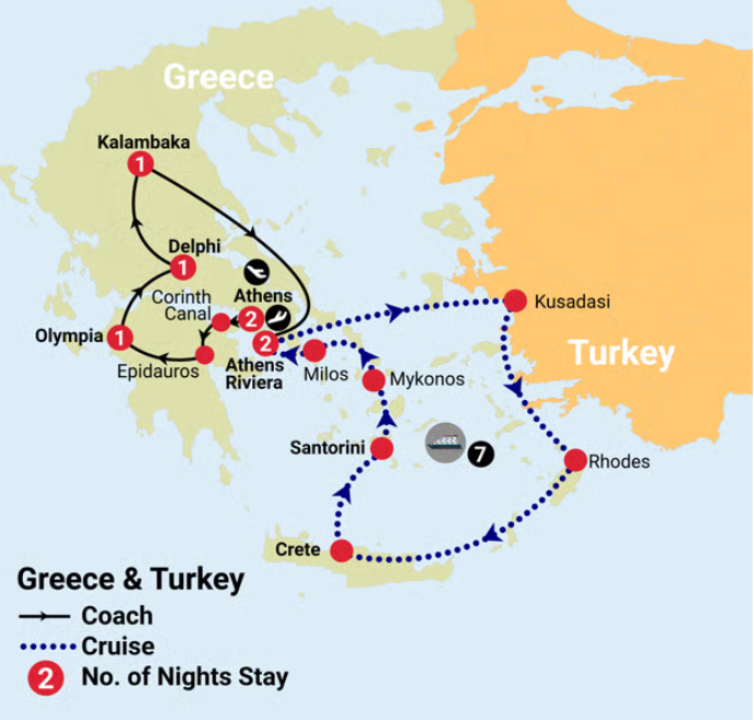 ✓ Transportation including dedicated coach on the mainland and transfer from Athens hotel to cruise port