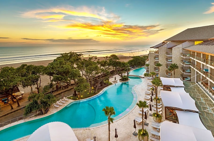 Discover new heights of secluded luxury at this five-star Jimbaran sanctuary, ideally located on Bali’s pristine southern peninsula. Though surrounded by lush Balinese jungle, this luxury hotel is a beach lover’s dream: just 10 minutes from Balangan Beach’s legendary waves and Dreamland Beach’s calm, limestone-hugged waters.